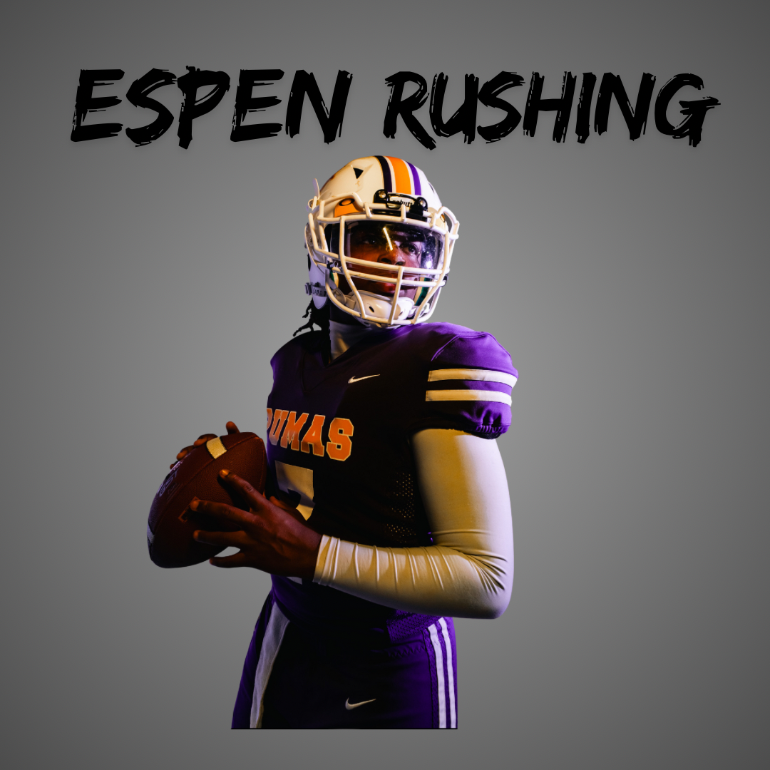Hello, my name is Espen Rushing, I am a Leader on and off the field and I am an honor roll student who excels both on the field and in the classroom. As a QB, I bring a strong arm, quick decision-making, and versatility of a dual-threat player. I thrive in the role, enjoying the challenges and responsibilities that come with leading my team. My dedication to academics and athletics reflects my commitment to excellence in all areas of life.